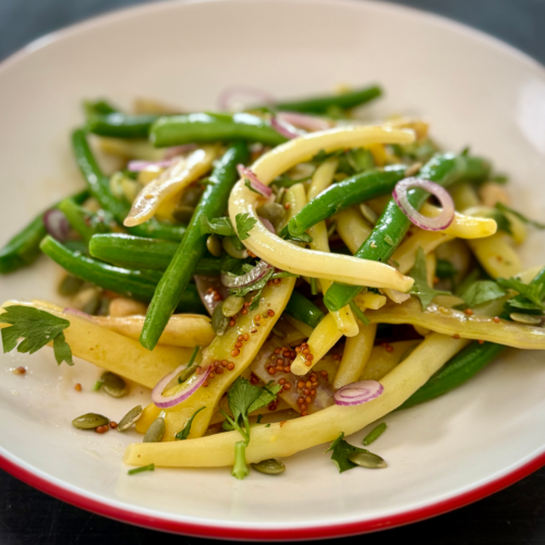 This Bean Salad is crisp, colorful, and perfectly dressed with a tangy-sweet honey mustard vinaigrette. Toasted nuts add crunch and richness. Serve it as a side dish to grilled chicken, salmon, shrimp, or even boiled eggs. This salad is a fresh companion for any meal.