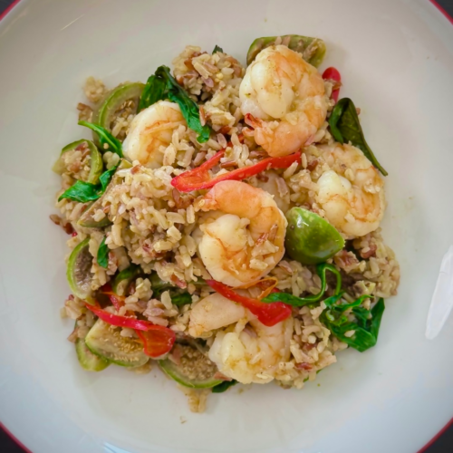 This Green Curry Fried Rice is a playful twist on one of Thailand’s most beloved dishes. While traditional green curry is served with steamed rice, here I turn those same bold, aromatic flavors into a quick, one-wok meal that’s both comforting and exciting. The coconut milk, basil, and curry paste bring that unmistakable Thai essence to make the dish rich, fragrant, and just the right amount of spicy. It’s wonderfully versatile too: use shrimp, chicken, tofu, or whatever protein you have on hand, and pair it with any rice you love. Authentic in flavor yet flexible in spirit, this dish proves that Thai cooking can be both simple and deeply satisfying.
