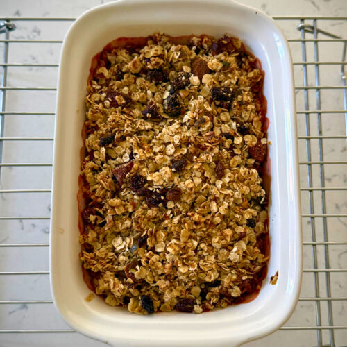 A wholesome take on a classic spring – summer dessert, this crumble features just-picked rhubarb and strawberries, gently cooked with coconut sugar until jammy and bright. The topping is a crunchy, golden blend of oats and nutty muesli—lightly sweet, rich in texture, and baked to perfection. It’s rustic, naturally sweetened, and just as good for breakfast as it is for dessert.