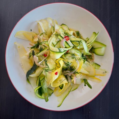 A light, vibrant salad of raw zucchini ribbons, tossed in a sweet-and-spicy vinaigrette and finished with herbs and toasted nuts. Refreshing, nourishing, and full of flavor.